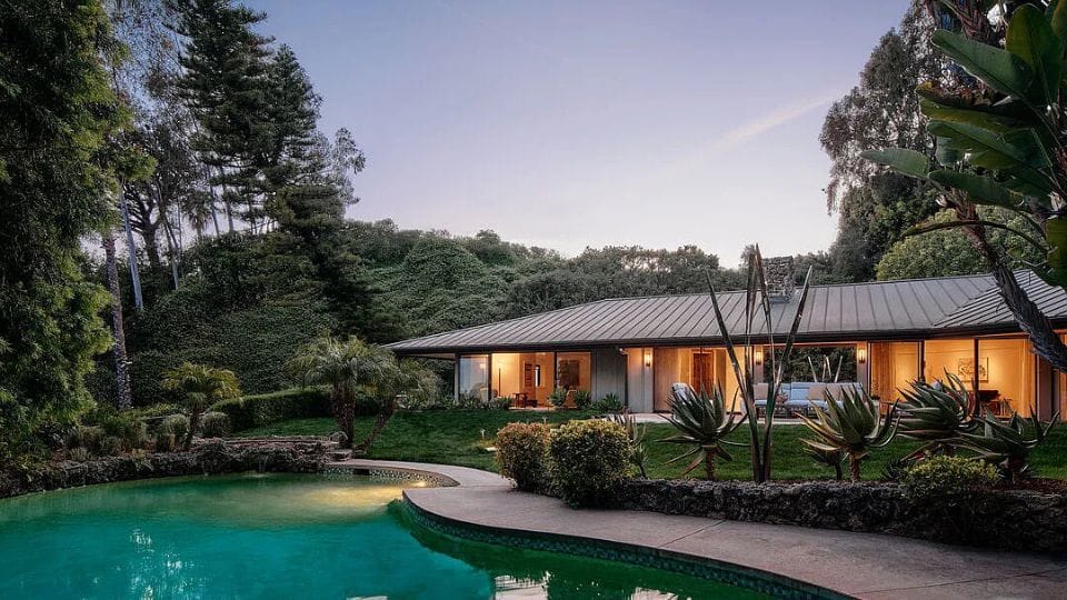 Deutsch even threw a presidential inauguration party there for Ronald Reagan, and the attic still holds remnants of Secret Service tape. Spread across 7,600 square feet, the estate includes six bedrooms, ten bathrooms, a guesthouse dubbed the “Whim House,” a pool and a tranquil courtyard shaded by pepper trees. It’s a rare blend of Hollywood glamour and timeless mid-century design.